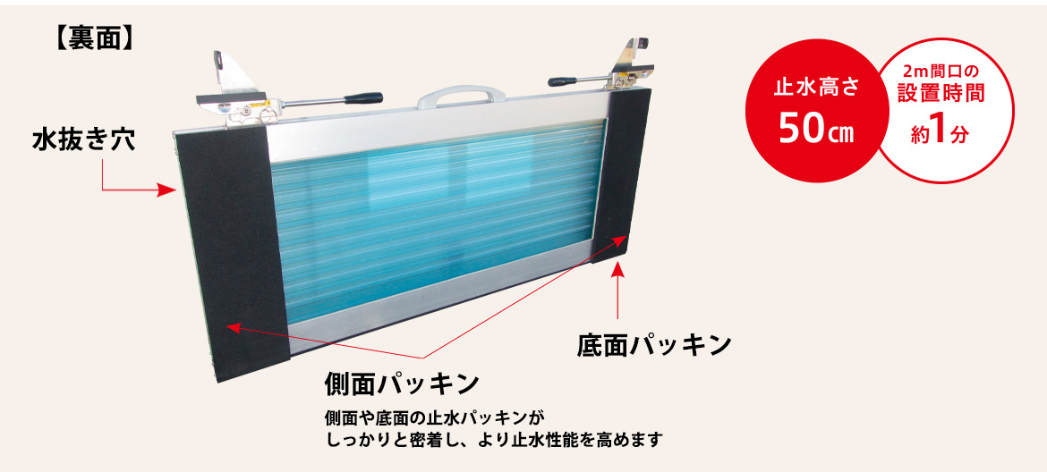 | 特徴 | ●高い止水性能をもつ止水高さ50cmの止水板 ●工事不要 ※設置環境により必要になる場合あり ●漏水量:1L/(h・m2)以下(※横幅2,000mmの場合) |